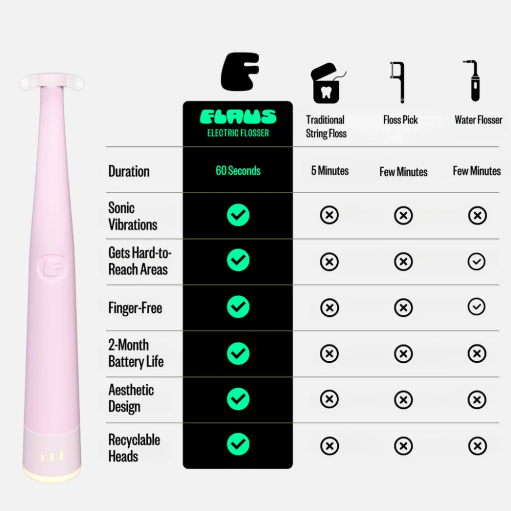 - Save time — Floss in under 1 minute (5x faster than traditional floss).